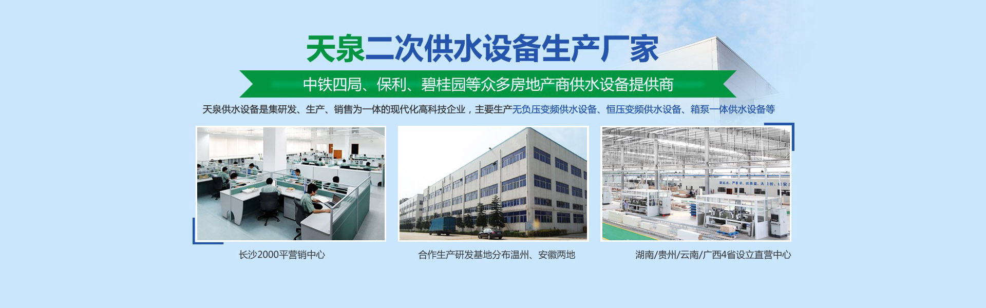 長沙天泉供水設備有限公司位于長沙雨花經(jīng)濟開發(fā)區(qū)。公司是集研發(fā)、生產(chǎn)、銷售為一體的現(xiàn)代化科技型企業(yè)公司生產(chǎn)銷售的產(chǎn)品有無負壓變頻供水設備、自來水加壓泵站、變頻調(diào)速恒壓供水設備、智慧標準泵房、智慧水務、一體化預制泵站、循環(huán)水系統(tǒng)工程等二十幾大類別。